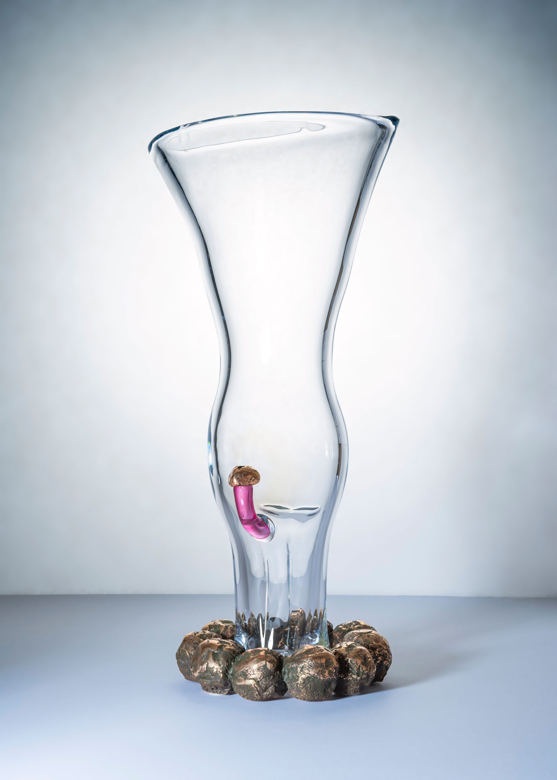 Happy and Full is an object that combines the fragility of blown glass with the heaviness and stability of bronze. The tension between these two materials symbolizes the contrasting forces of inner balance and outer manifestation. The organically shaped base of bronze spheres refers to male fertility, strength and determination. It evokes a state of fulfillment in which softness and solidity complement each other.