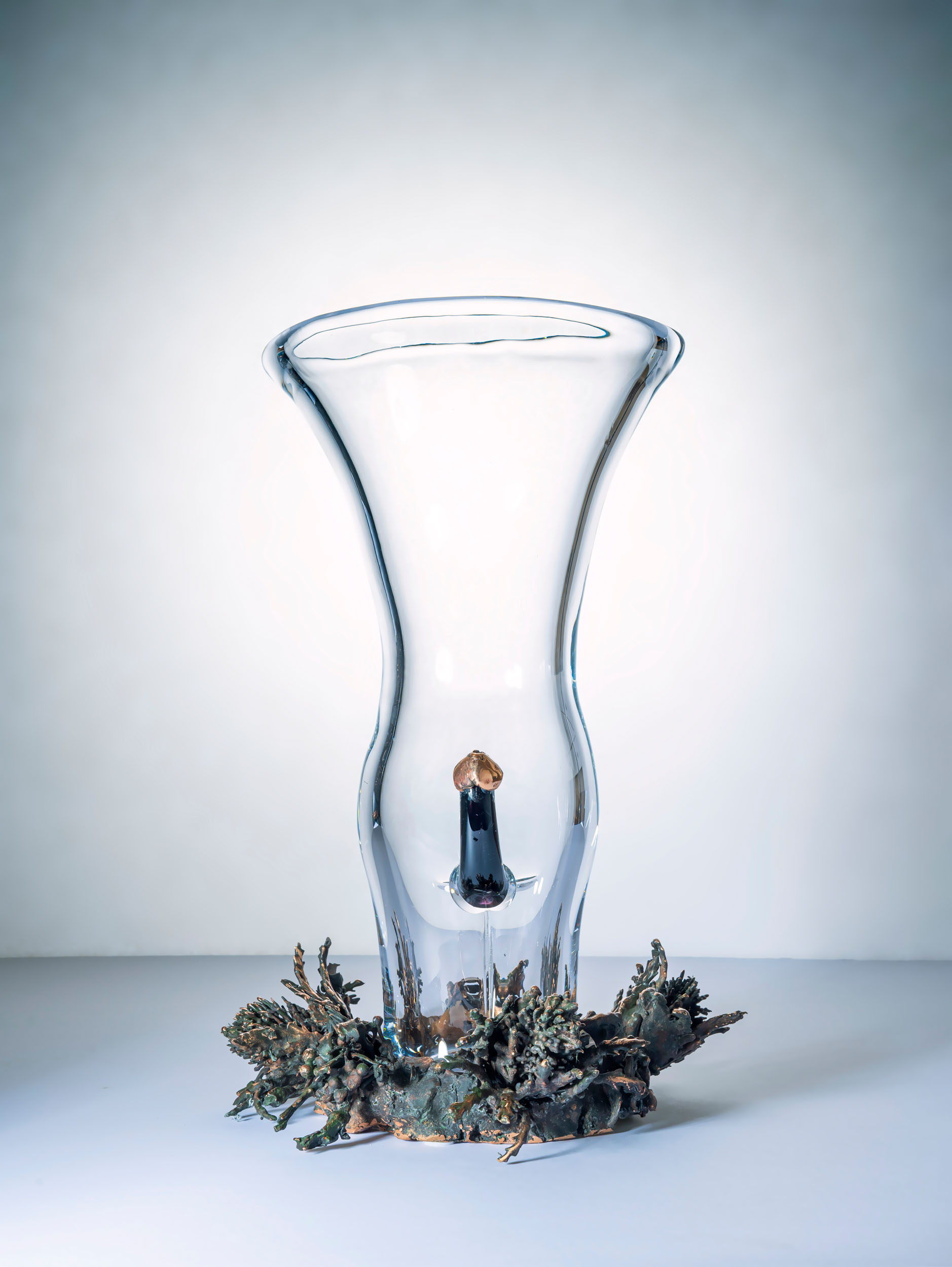 Happy and Spiky / Happy and Spiky is an object made of blown glass and bronze, in which fragility and sharpness are intertwined. The bronze thistles, evoking the masculine principle and the phallic symbol, create a strong contrast to the transparent glass form. The work oscillates between subtlety and provocation, between attractiveness and danger. It playfully opens up questions related to identity, sexuality and the symbolism of the body.