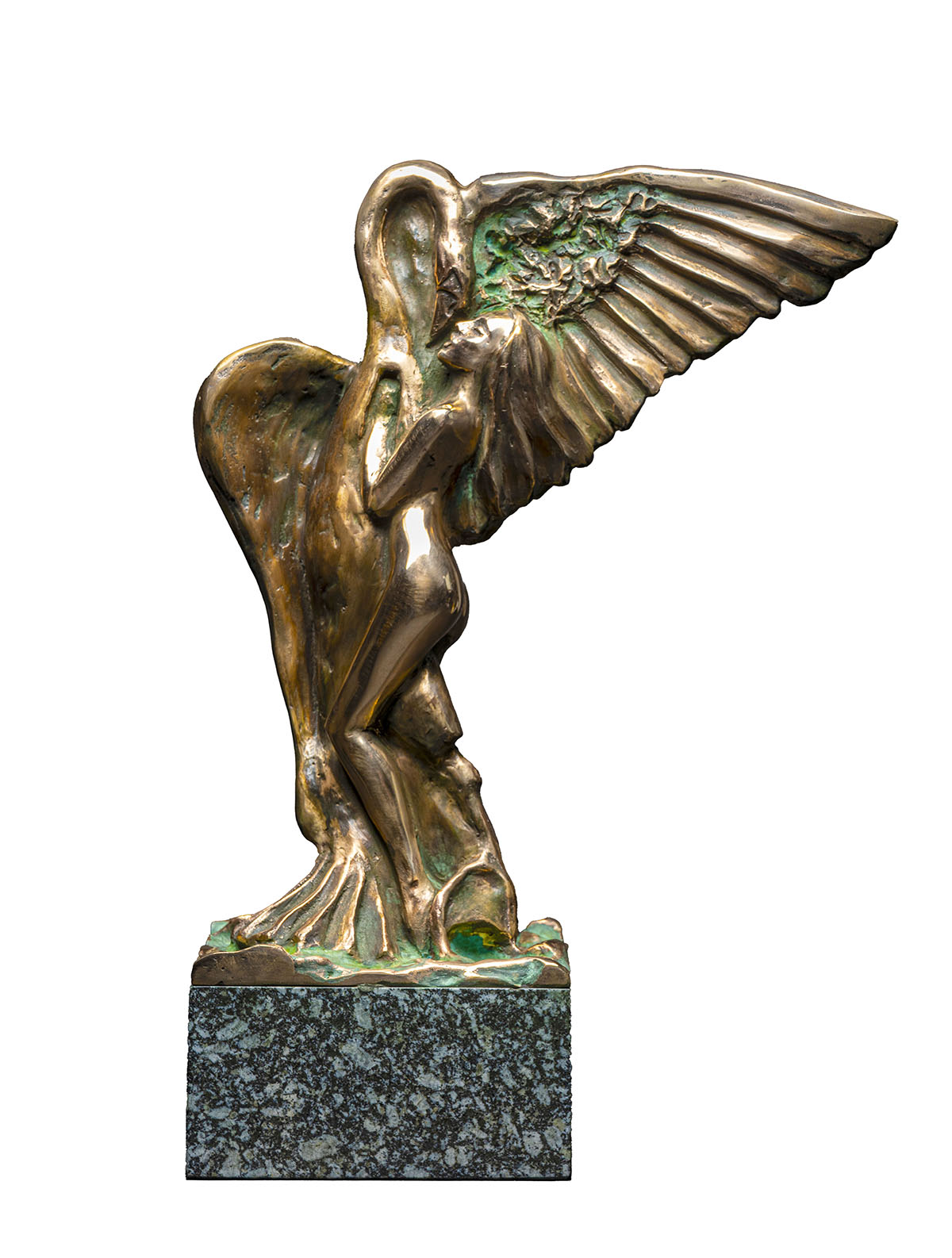 Zobrazuje mýtický príbeh Ledinej zvodnej noci s Diom, ktorý sa jej zjavil v podobe majestátnej labute. Grécka mytológia rozpráva o okamihu, keď sa boh Olympu premieňa, aby sa priblížil k Lede – tento moment je tu zachytený v nesmierne expresívnej forme. Nadrozmerná labuť, ktorá prevyšuje ženskú postavu, zosobňuje nielen Zeusovu moc, ale aj jeho dominanciu v tomto osudovom stretnutí. Je zobrazením spojenia božského s ľudským.